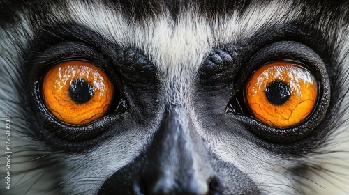Naklejka premium Close-up view of a lemur's intense bright orange eyes and detailed facial fur textures conveying curiosity and alertness