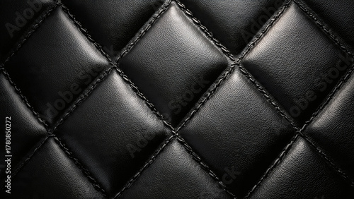 © CHAWAPON, Obraz premium Close-up view of a luxurious black quilted material, showcasing a classic diamond pattern with meticulous stitching. This elegant texture is ideal for sophisticated backgrounds and design