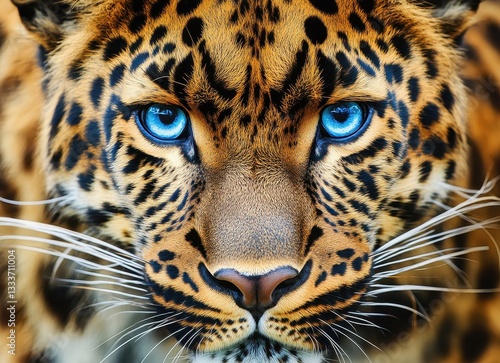 Fototapeta premium Close-Up View of a Majestic Leopard with Striking Blue Eyes and Intricate Fur...