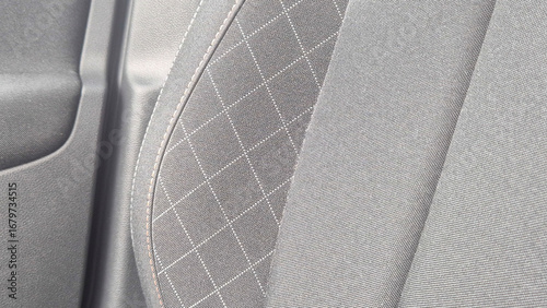 © daily_creativity, Obraz premium Close-up view of a modern car seat fabric, showcasing an intricate quilted pattern and smooth texture. Ideal for automotive design or upholstery themes.