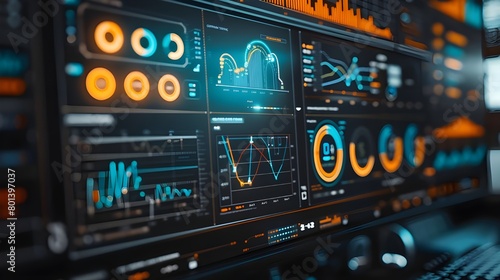 © Muzikitooo, Obraz premium Close up view of a monitor showing an analytics dashboard.