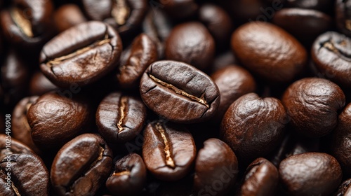 Fototapeta premium Close-up view of a pile of roasted coffee beans with a rich, dark color...