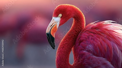 © Oleh, Obraz premium Close up view of a pink flamingo displaying its stunning plumage against a softly blurred background during sunset, creating a vibrant and enchanting scene filled with warm colors