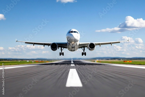 © pavlofox, Fototapeta premium Close-up view of a plane gaining speed during takeoff from the runway at sunset