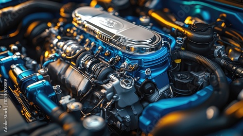 © Nuriya, Fototapeta premium Close-up view of a powerful blue engine with chrome accents.
