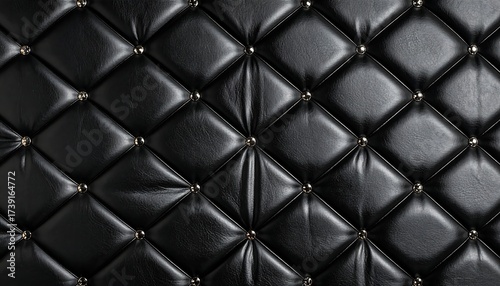 © Johan, Naklejka premium Close-up view of a quilted, black leather surface with diamond-shaped patterns and golden stud details, creating a luxurious texture