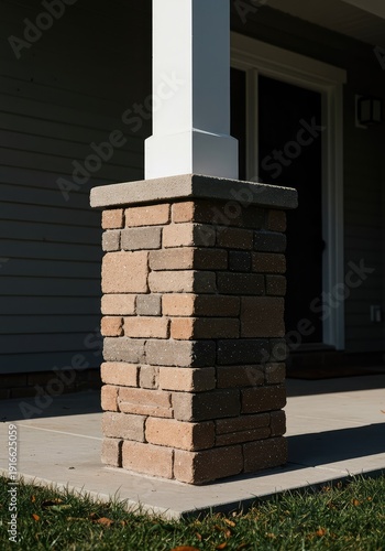 Fototapeta premium Close-up view of a robust, square masonry porch pier supporting a residential...