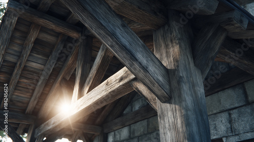 © Maryna, Fototapeta premium Close-up view of a rustic wooden structure with intricate beams and sunlight filtering through, showcasing craftsmanship and natural beauty.