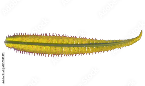 © Dewi, Naklejka premium Close-up view of a segmented, elongated, yellow-green leaf-like organism. Detailed structure and textures are visible