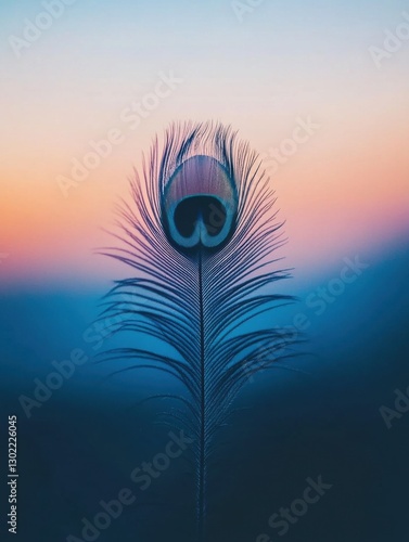 Obraz premium Close-up view of a single vibrant peacock feather against a soft gradient background during dusk hours