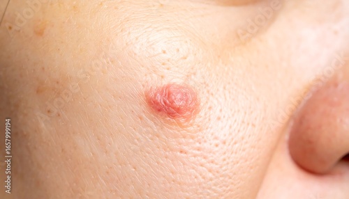 © oziel, Fototapeta premium Close-up view of a skin lesion with a reddish-pink hue on a light complexion.