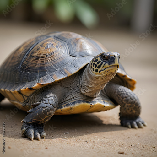 © Miarzi, Obraz premium Close-up View of a Striking Yellow-margined Box Turtle on Sandy Ground