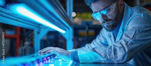© Waraporn, Fototapeta premium Close up view of a technician or engineer working on an intricate electronic circuit board with various microchips and components in a futuristic blue lit workspace or laboratory setting