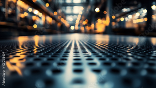© Shahazadi, Obraz premium Close-up view of a textured metallic surface in an industrial setting with blurred lights