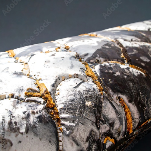 © Gendok, Obraz premium Close-up view of a textured, quilted surface with silvery-gray and dark-gray panels, accented by orange stitching, creating a visually compelling design.
