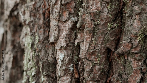© Hasriani, Naklejka premium Close-up view of a textured tree bark, exhibiting deep grooves and various shades of brown, with flecks of green moss.