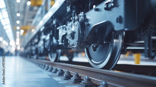 Fototapeta premium Close-up view of a train coupling mechanism and wheels on tracks in a...