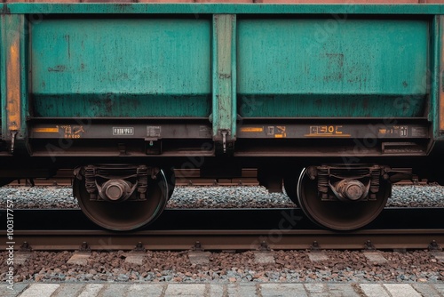 © Andrii, Naklejka premium Close up view of a turquoise freight train car on tracks near a station during daylight hours