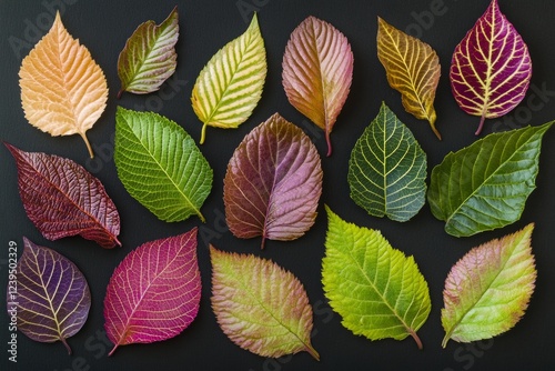 Naklejka premium Close-up view of a vibrant collection of seedling leaves exhibiting various shapes and colors, arranged artistically against a dark backdrop. Each leaf showcases intricate textures and patterns