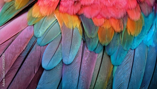 Obraz premium close up view of a vibrant colorful wing feathers in a spectrum of pastel hues from teal to pink orange and purple are densely clustered