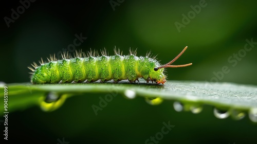 Fototapeta premium Close-up view of a vibrant green caterpillar with intricate textures and fine details, showcasing its segmented body and tiny bristles on a leaf