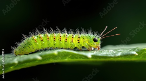 © busro, Naklejka premium Close-up view of a vibrant green caterpillar with intricate textures and fine details, showcasing its segmented body and tiny bristles on a leaf