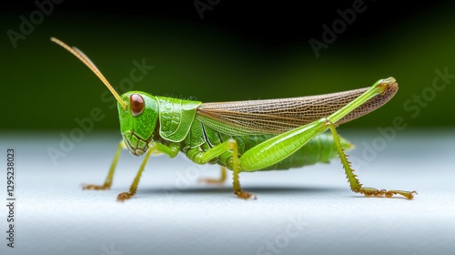 Fototapeta premium Close-up view of a vibrant green grasshopper on a surface with a blurred...