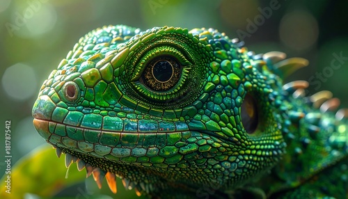 © Alam, Fototapeta premium Close-up view of a vibrant green iguana with focused eye detail