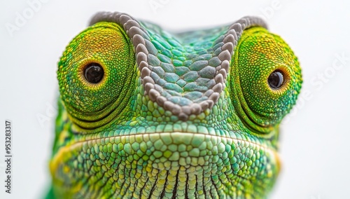 © ArtCookStudio, Fototapeta premium Close-up view of a vibrant green lizard basking under soft light in a natural habitat