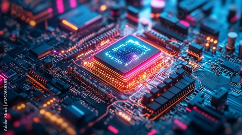 © MUMTAZ, Fototapeta premium Close-up view of a vibrant microchip on a circuit board, showcasing intricate details and glowing elements