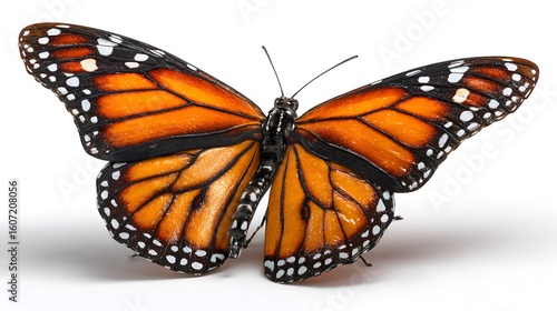 © Khorshada, Fototapeta premium Close up view of a vibrant monarch butterfly with intricate wing patterns against a white background