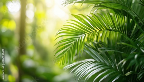 Obraz premium Close-up view of a vibrant palm leaf amidst lush forest greenery.