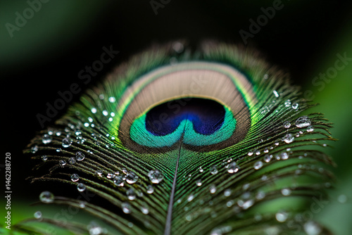 © pavlofox, Naklejka premium Close-up view of a vibrant peacock feather adorned with dew droplets in a lush green environment