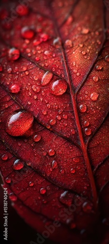 © DenS, Fototapeta premium Close-up view of a vibrant red leaf covered in water droplets.