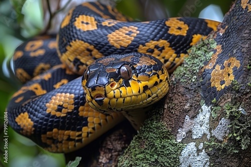 Fototapeta premium Close-up view of a vibrant yellow and black boa constrictor snake coiled around a mossy branch in a green forest