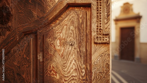 © The 2R Artificiality, Fototapeta premium Close-up view of a vintage wooden door showcasing intricate patterns and textures