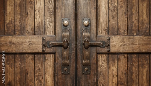 © DigitalDruid, Fototapeta premium Close-up view of an aged wooden double barn door featuring metal handles and bolts, emphasizing rustic charm and durability