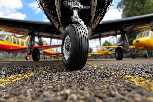 © Nataliya, Fototapeta premium Close-up view of an aircraft tire on a runway with colorful planes in background