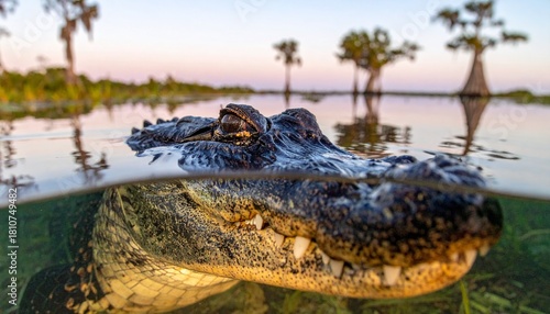 © Agus, Obraz premium Close-up view of an alligator's head emerging from tranquil water, with a serene landscape.
