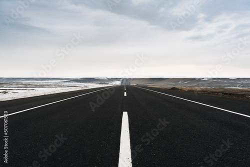 © ardasavasciogullari, Fototapeta premium Close up View of an emtpy asphalt road with lanes and snow in winter