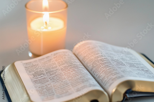 © Maxim, Fototapeta premium Close-up view of an open Bible with highlighted passages next to a lit candle, symbolizing reflection during Easter celebrations in 2025