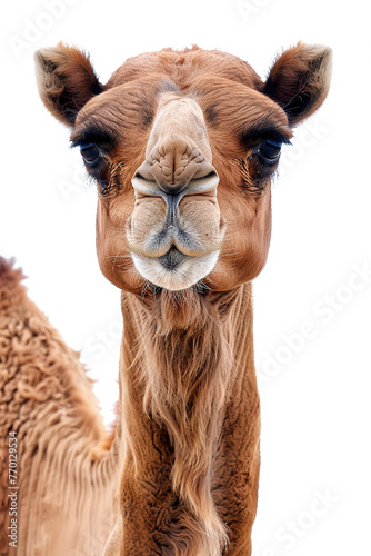 © thebaikers, Obraz premium close up view of arabian camel head looking straight to the camera isolated on white background. zoom view of camel face.