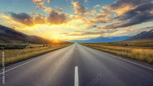 © dsant, Naklejka premium Close up view of asphalt road and mountains with sunset view. Ai generated image