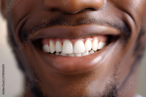 © Olesia Khazova, Fototapeta premium Close up view of beaming white wide male smile, african black man with healthy straight clean teeth, tooth health care whitening dentistry concept