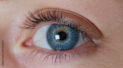 © Duskcraft, Fototapeta premium Close-Up View of Beautiful Blue Eye with Detailed Iris and Long Lashes