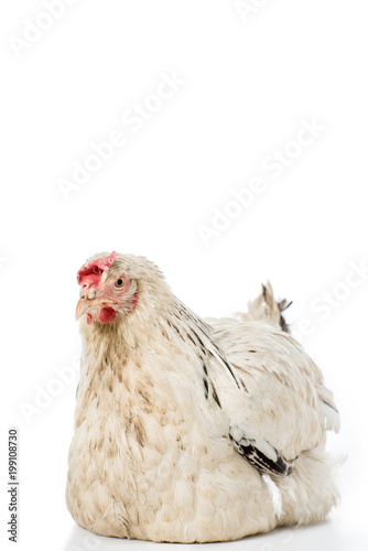 Fototapeta premium close-up view of beautiful white hen lying isolated on white