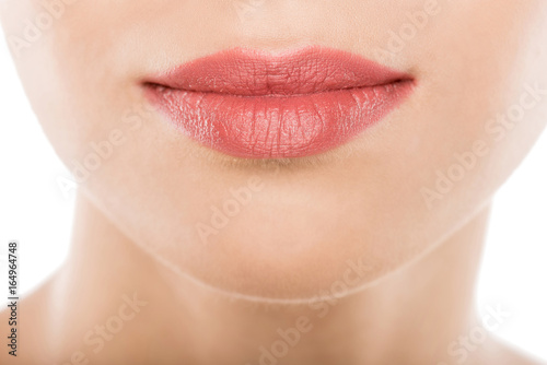 Obraz premium close up view of beautiful woman with lipstick, isolated on white