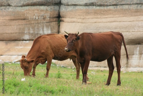 © master_77, Fototapeta premium Close up view of beef cattle grazing outside the farm.
