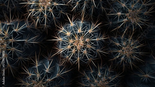 © Ilmi, Obraz premium Close-Up View of Black Cactus Texture in Desert Environment with Intricate Spines and Patterns