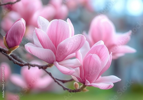 © letter, Fototapeta premium Close-Up View of Blooming Pink Magnolia Flowers on Tree Branch in Springtime